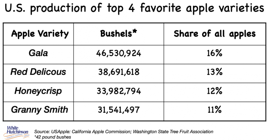 The 34 billion bushels of Honeycrisp apples produced in 2025 equal roughly 3.4 billion apples, or approximately 10 Honeycrisp apples for every child and adult in the U.S.