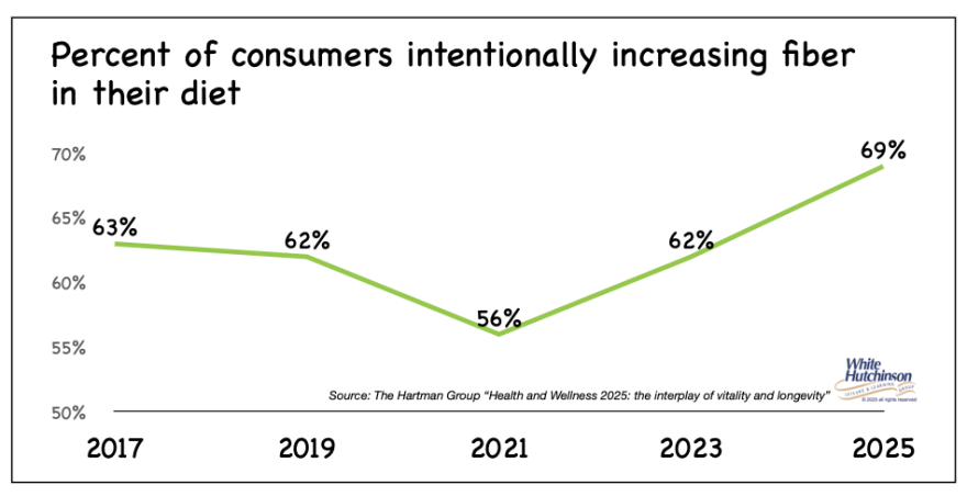As protein claims approach saturation, the Hartman Group's research signals a clear shift. Consumers are increasingly turning to fiber to improve digestion, metabolic health, and everyday wellness. Social trends like "fiber‑maxxing" and the use of GLP-1 are pushing consumers to seek more fiber per bite, especially in bars, drinks, and "functional" snacks.