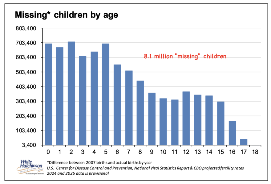 Here's a breakdown of the 2025 decline in the current number of children by age since 2007. For all ages, there are 8.1 million fewer children than if the 2007 birthrate had remained constant. For example, there are 695,000 fewer 5-year-olds and 444,000 less 8-year-olds.