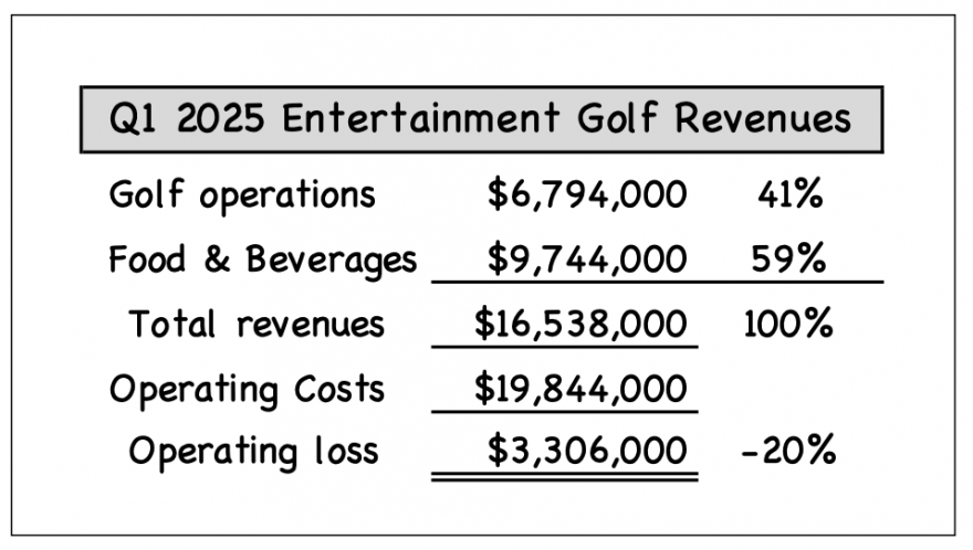 Their Q1 2025 Entertainment Golf operating loss of $3,306,000 is more than double their Q1 2024 $1,594,000 operating loss. EBIDTA for Entertainment Golf declined from $4,441,000 in Q1 2024 to $911,000 in Q1 2025. Their Q1 2025 F&B COGS was 24.7%, up from 21.8% in Q1 2024.