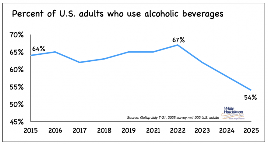 Fifty-four percent of respondents reported that they sometimes drink wine, beer, or liquor. That's a 10-percentage point drop from just 10 years ago. It's the lowest percent since 1939, when Gallup started surveying Americans on their drinking habits.