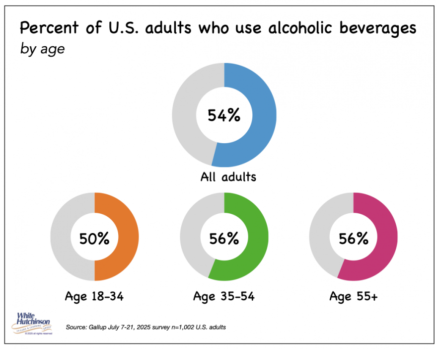 Age 18-34 younger adults had a 9-percentage point drop from 2023 and showed the lowest participation, with just half now drinking alcohol (50%).