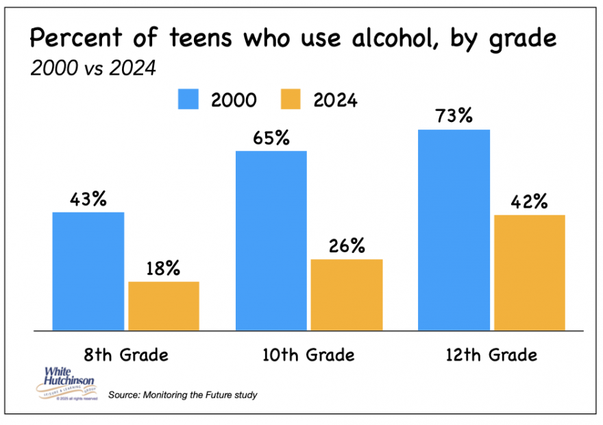 Teen alcohol use has also steadily declined from 2000 to 2024. It has decreased from 73% to 42% for 12th graders, from 65% to 26% for 10th graders, and from 43% to 13% for 8th graders, according to the Monitoring the Future study.
