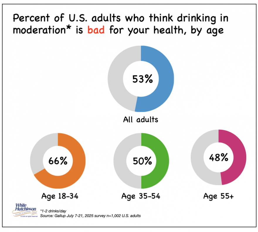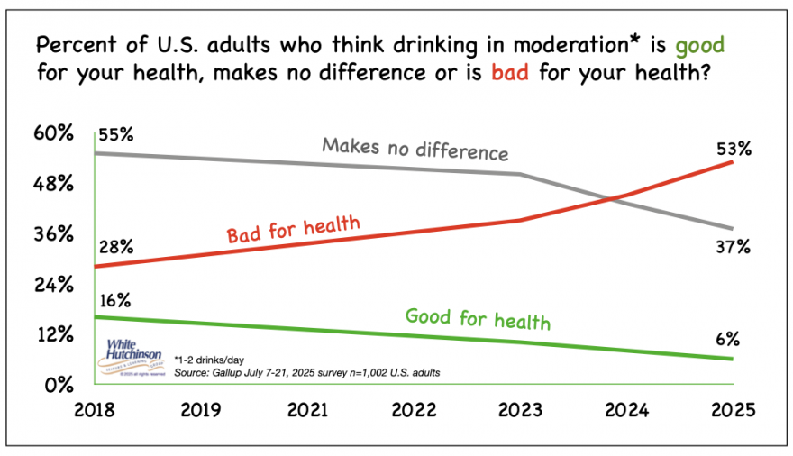According to a July 2025 Gallup poll, the share of Americans who drink alcohol has fallen to a record low. At the same time, a record-high share of Americans believes consuming alcohol, even in moderation, is unhealthy.