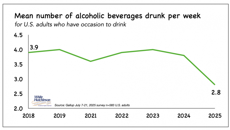 Factoring in all drinkers, including those who did not drink in the past week, the average number of drinks consumed over the past seven days in the study was 2.8, the lowest figure Gallup has recorded since 1996. This is down by one-quarter (-26%) from 3.8 drinks a year ago.